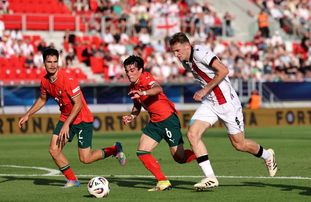 Portugal took some time to find their groove, but once they did, Diogo Nascimento and Paulo Bernardo took control of the game from midfield. Geovany Quenda also displayed exceptional skill in possession, setting the stage for Portugal’s first goal in the 24th minute. It came in rather anticlimactic fashion when Luka Kharatishvili mishandled Rodrigo Pinheiro’s weak shot, allowing it to trickle into the net.